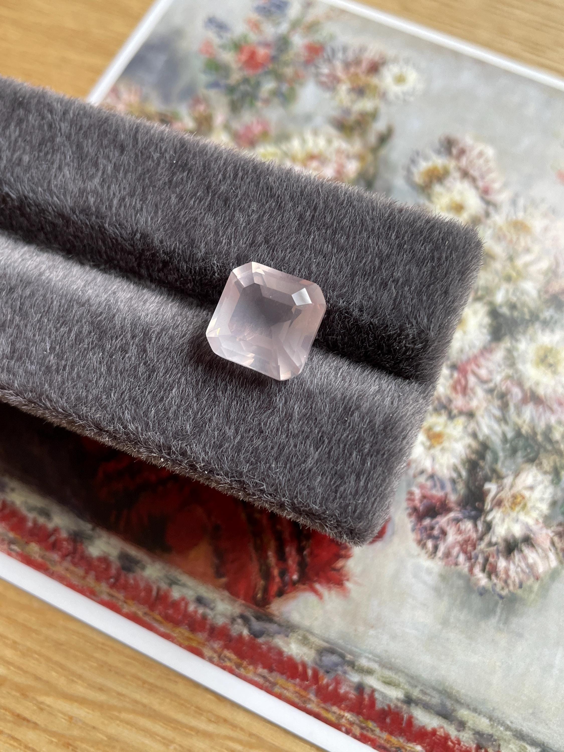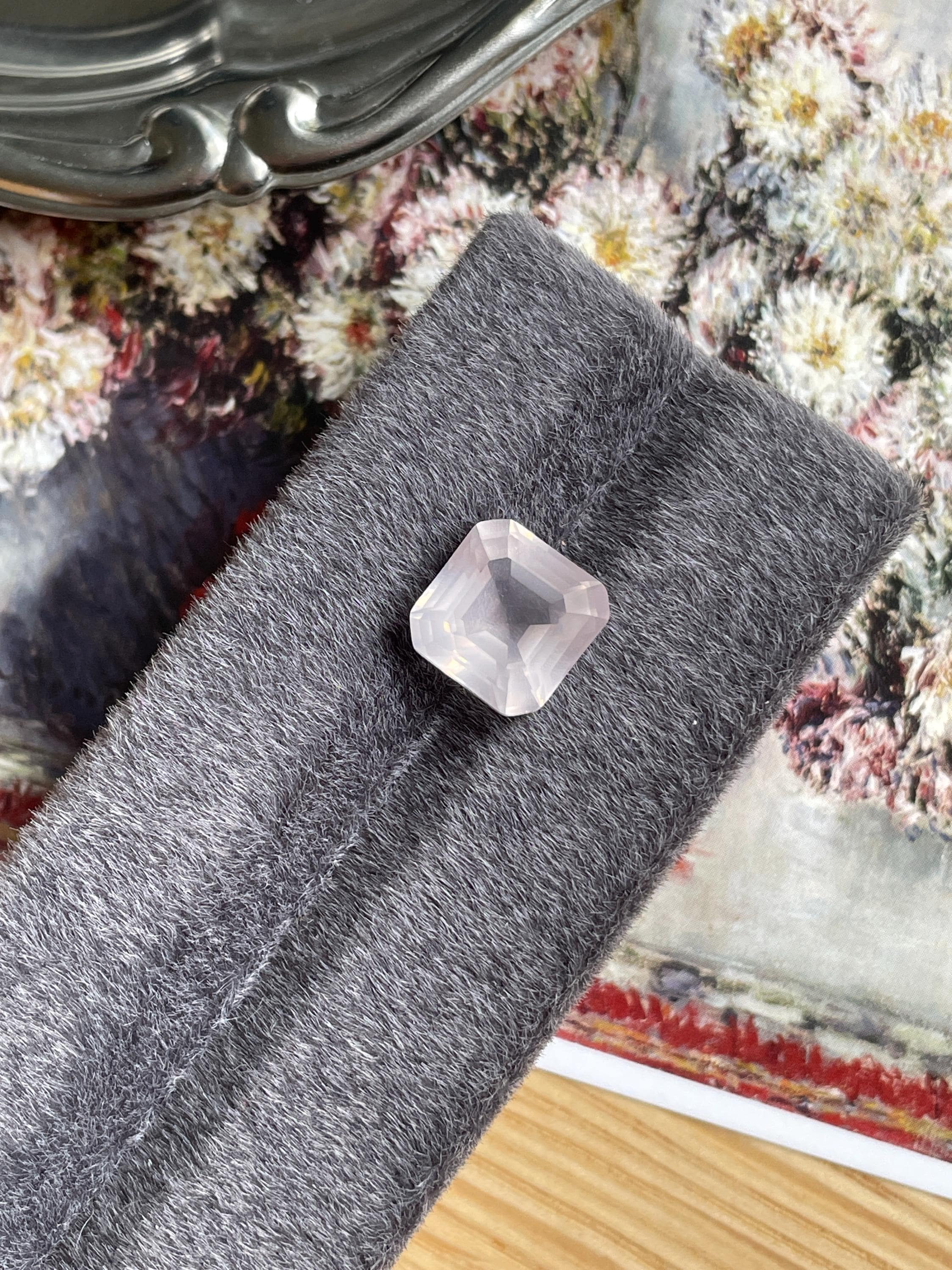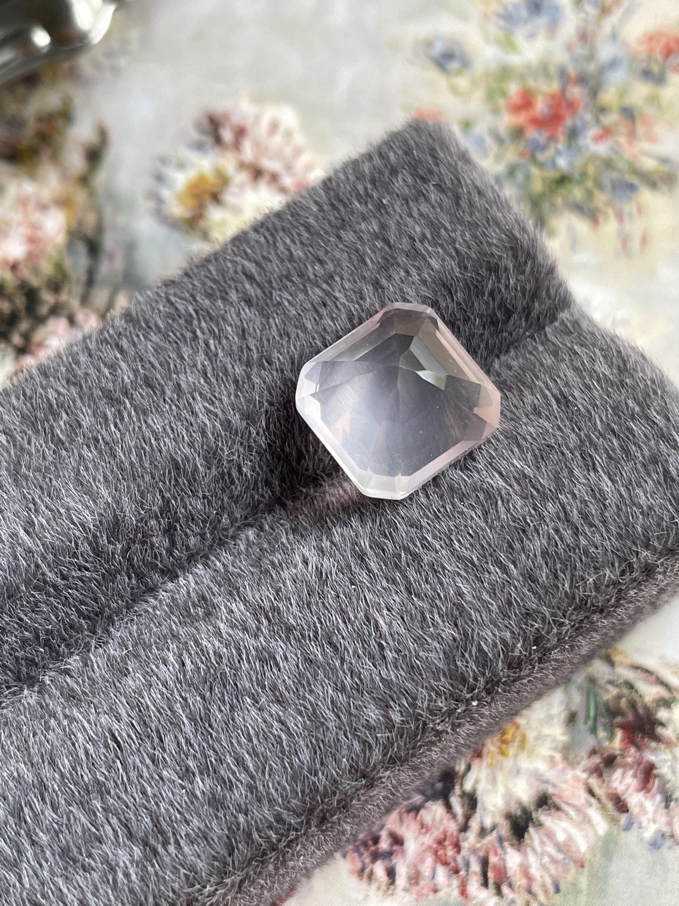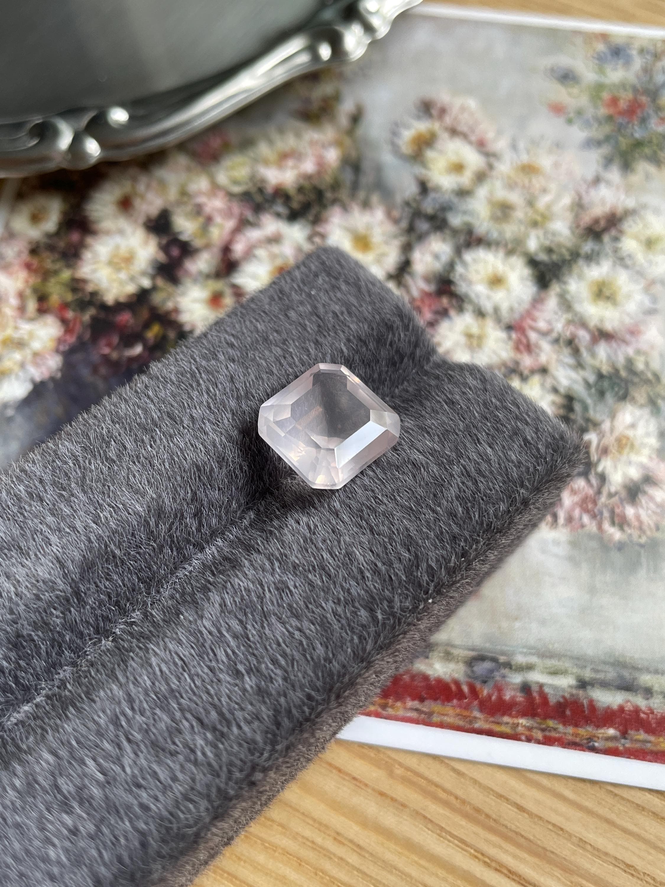This soft pastel, delicate pink 5.09ct faceted rose quartz features the classic squared octagonal asscher cut that showcases elegance and romance. The milkiness also gives it a dreamy vibe, making it perfect for rings, pendants, or any custom designs.