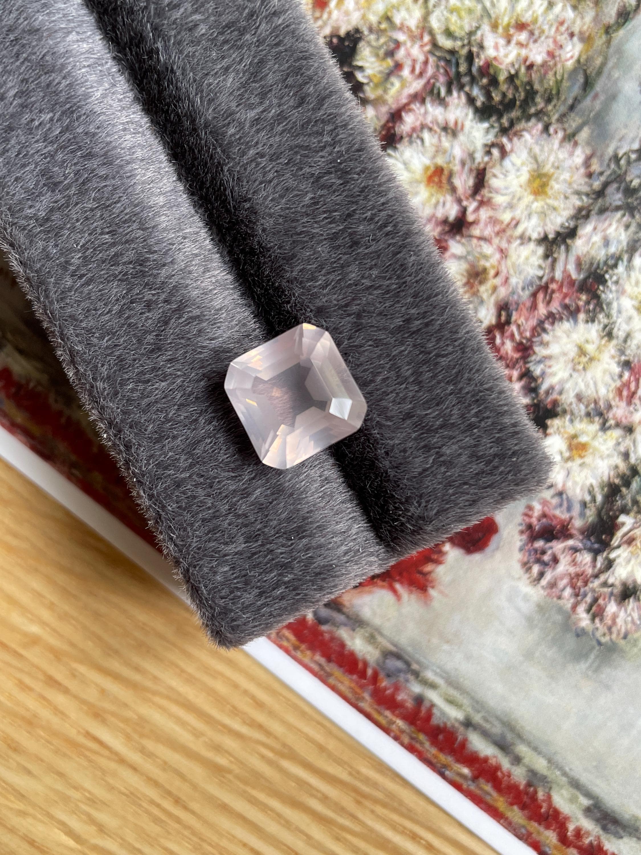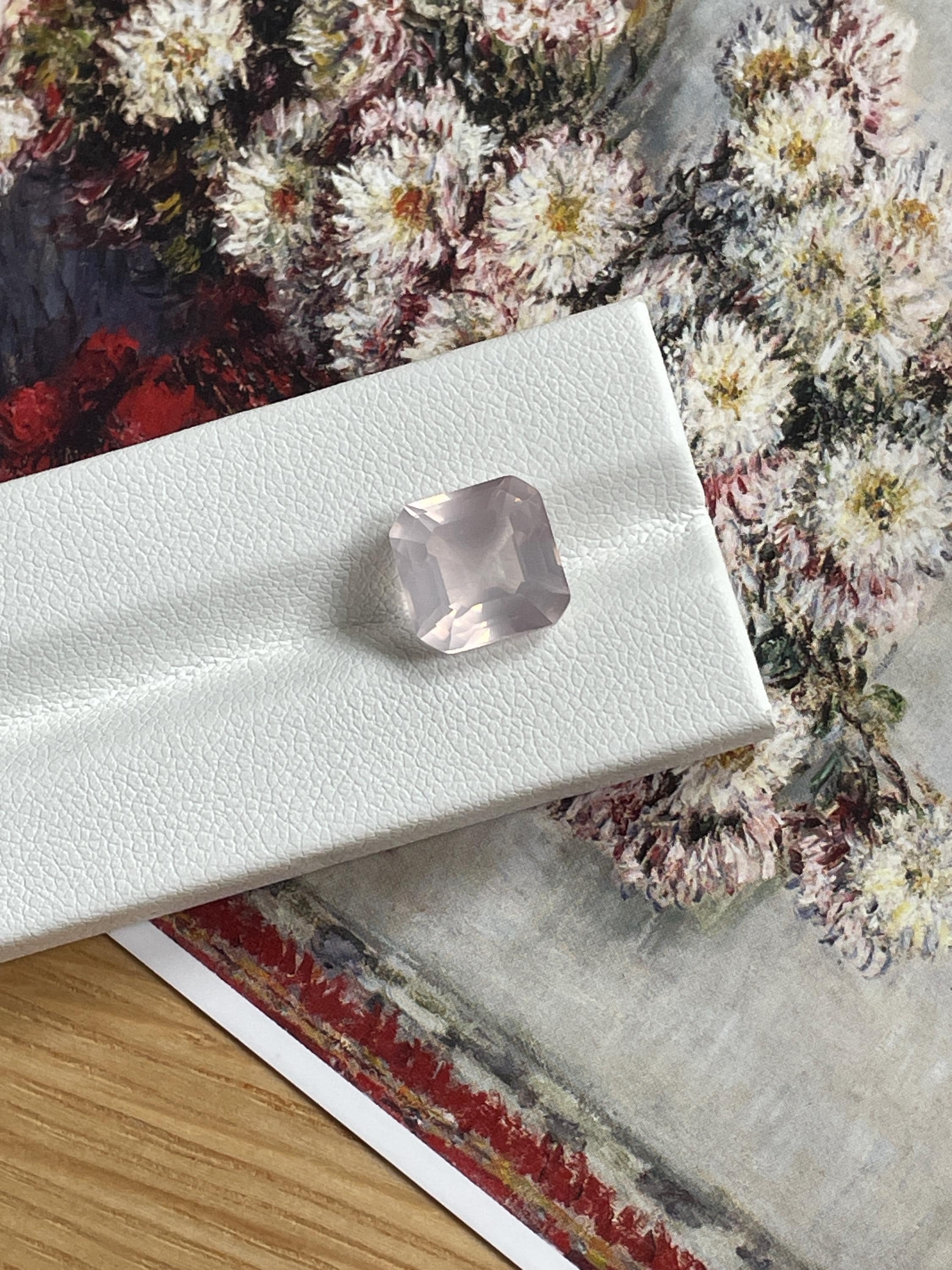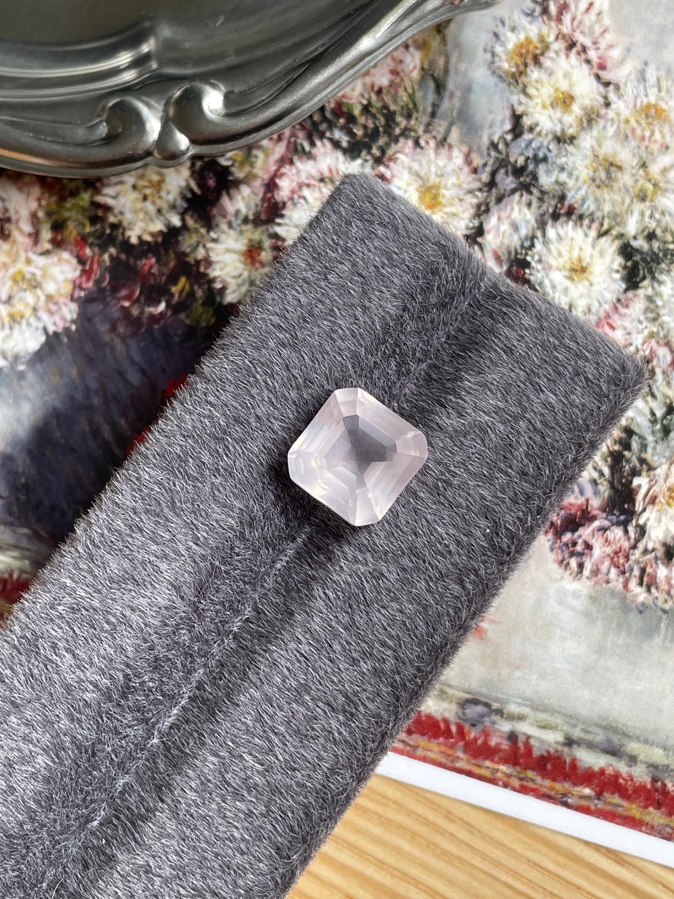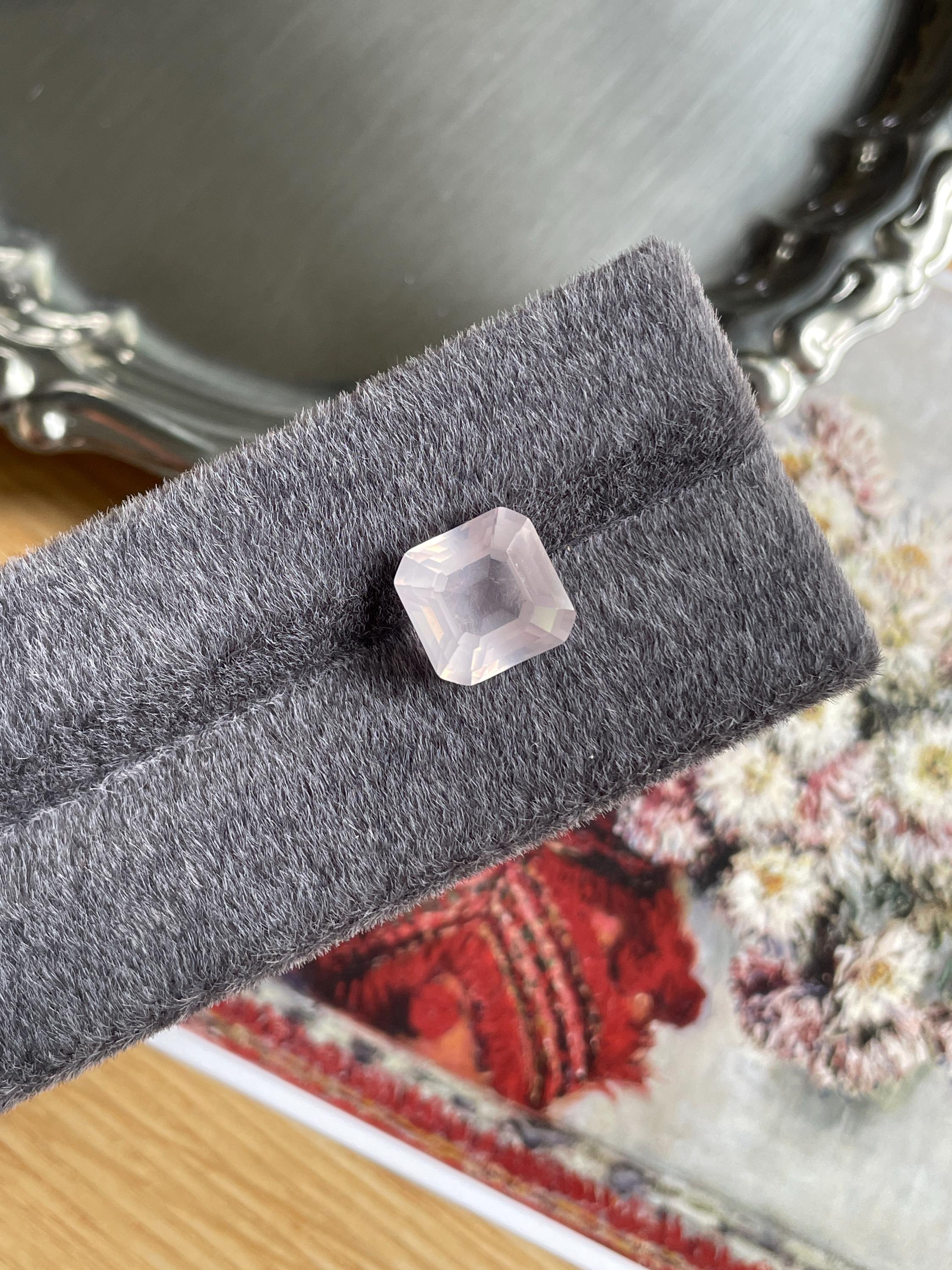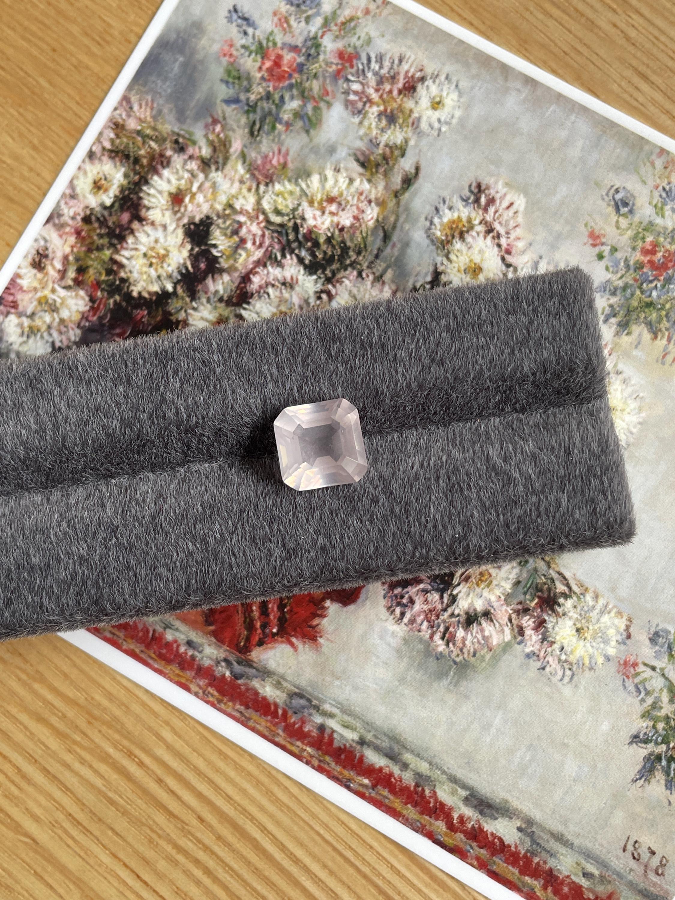 This soft pastel, delicate pink 5.09ct faceted rose quartz features the classic squared octagonal asscher cut that showcases elegance and romance. The milkiness also gives it a dreamy vibe, making it perfect for rings, pendants, or any custom designs.