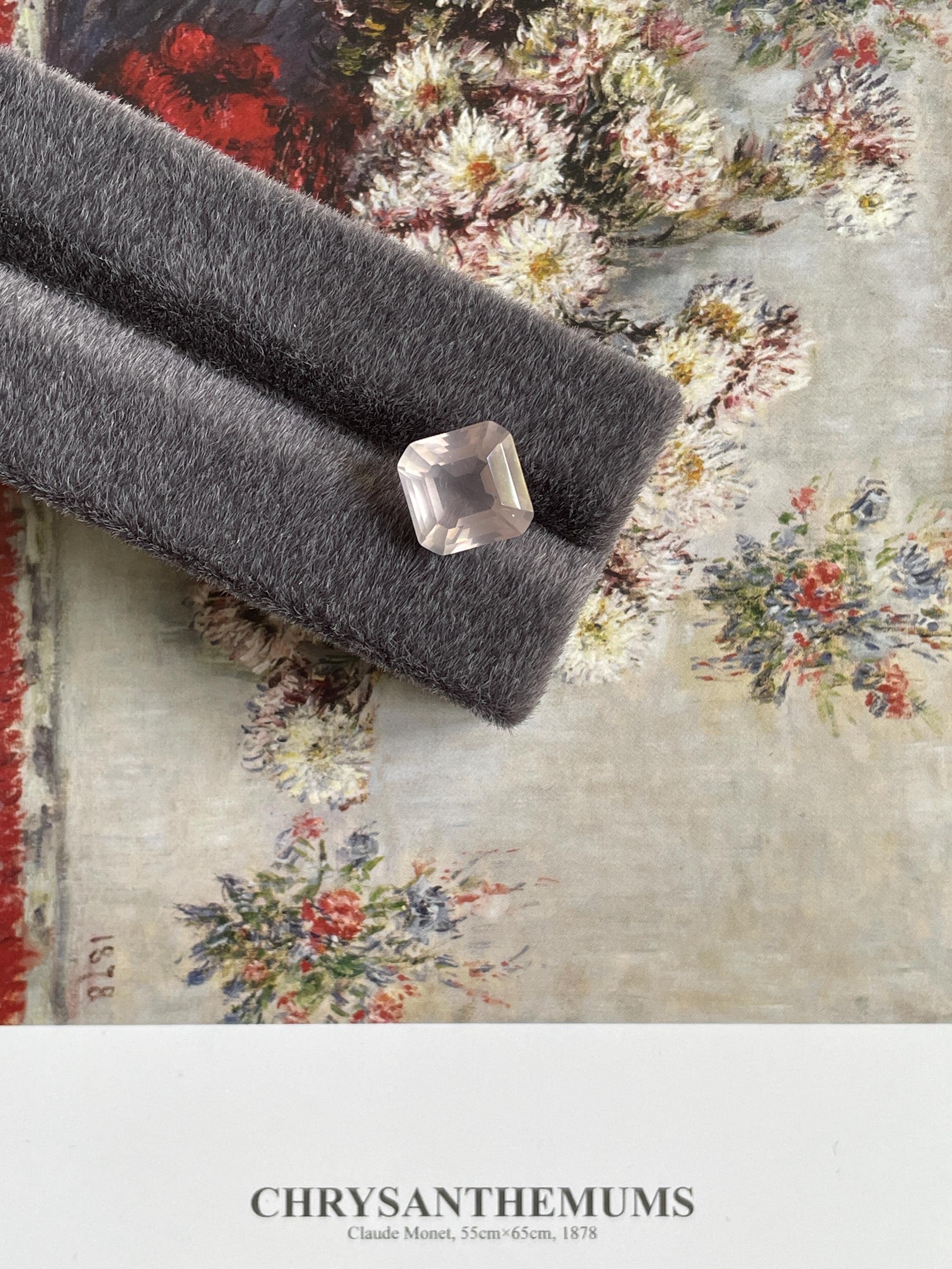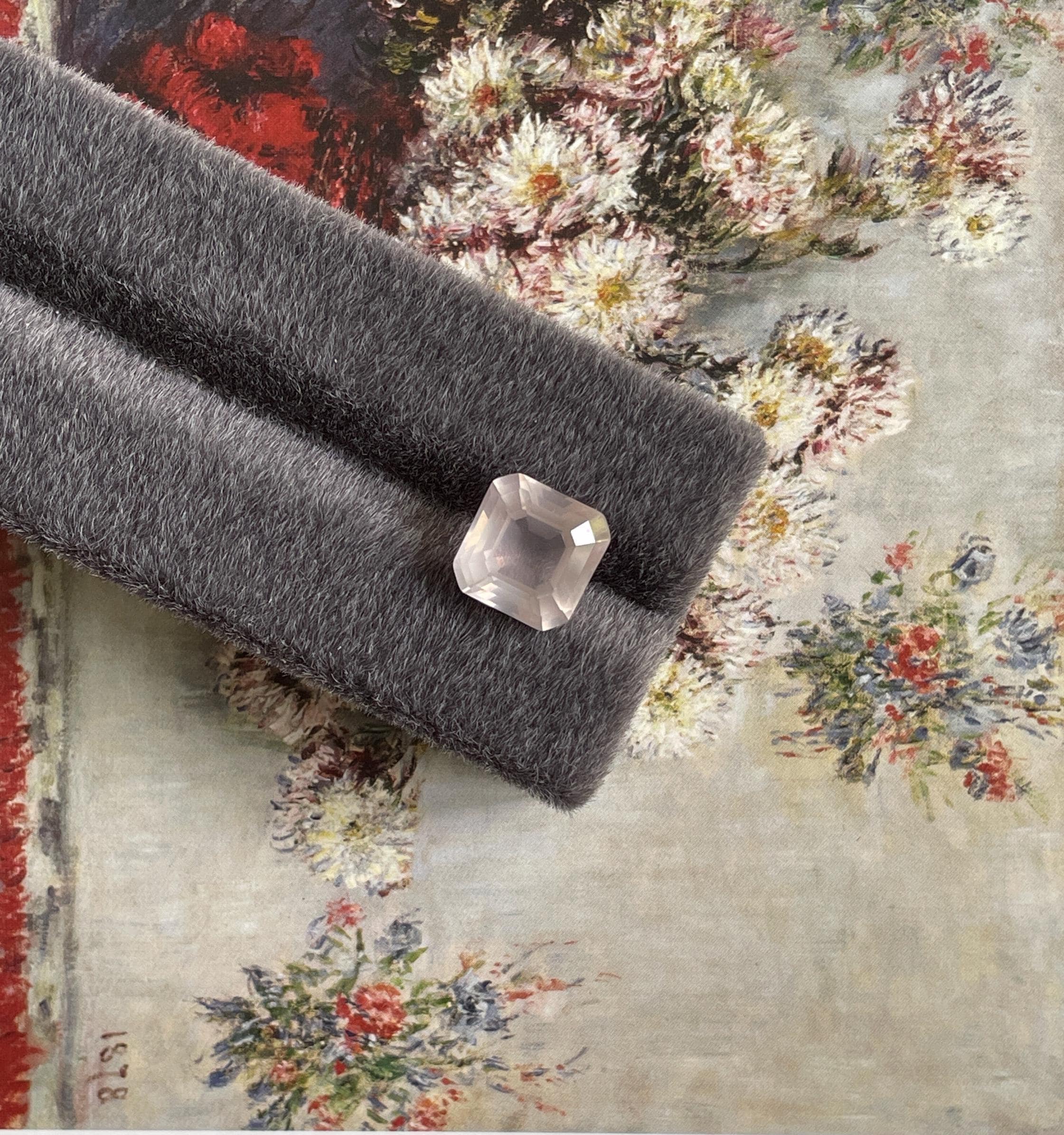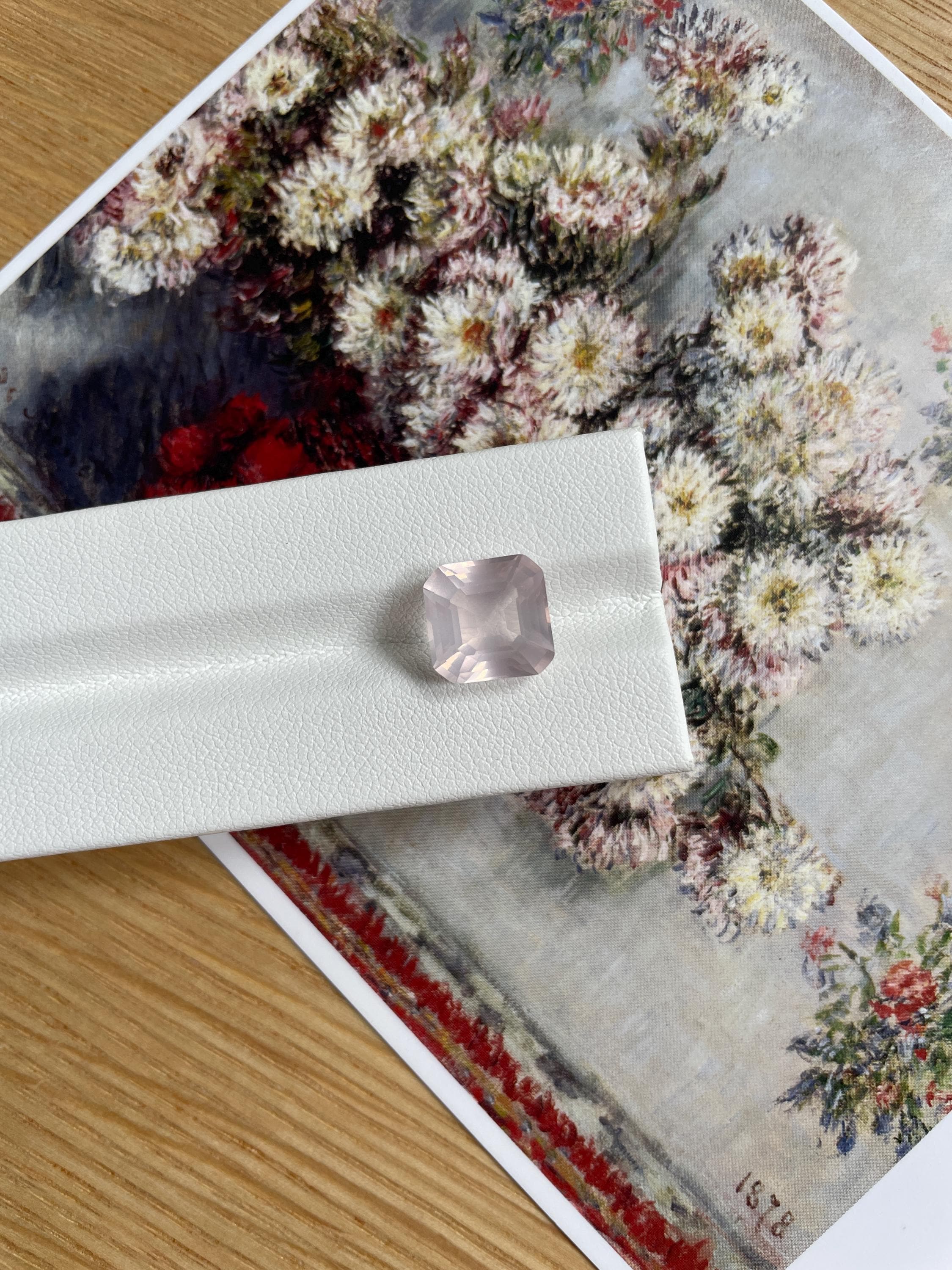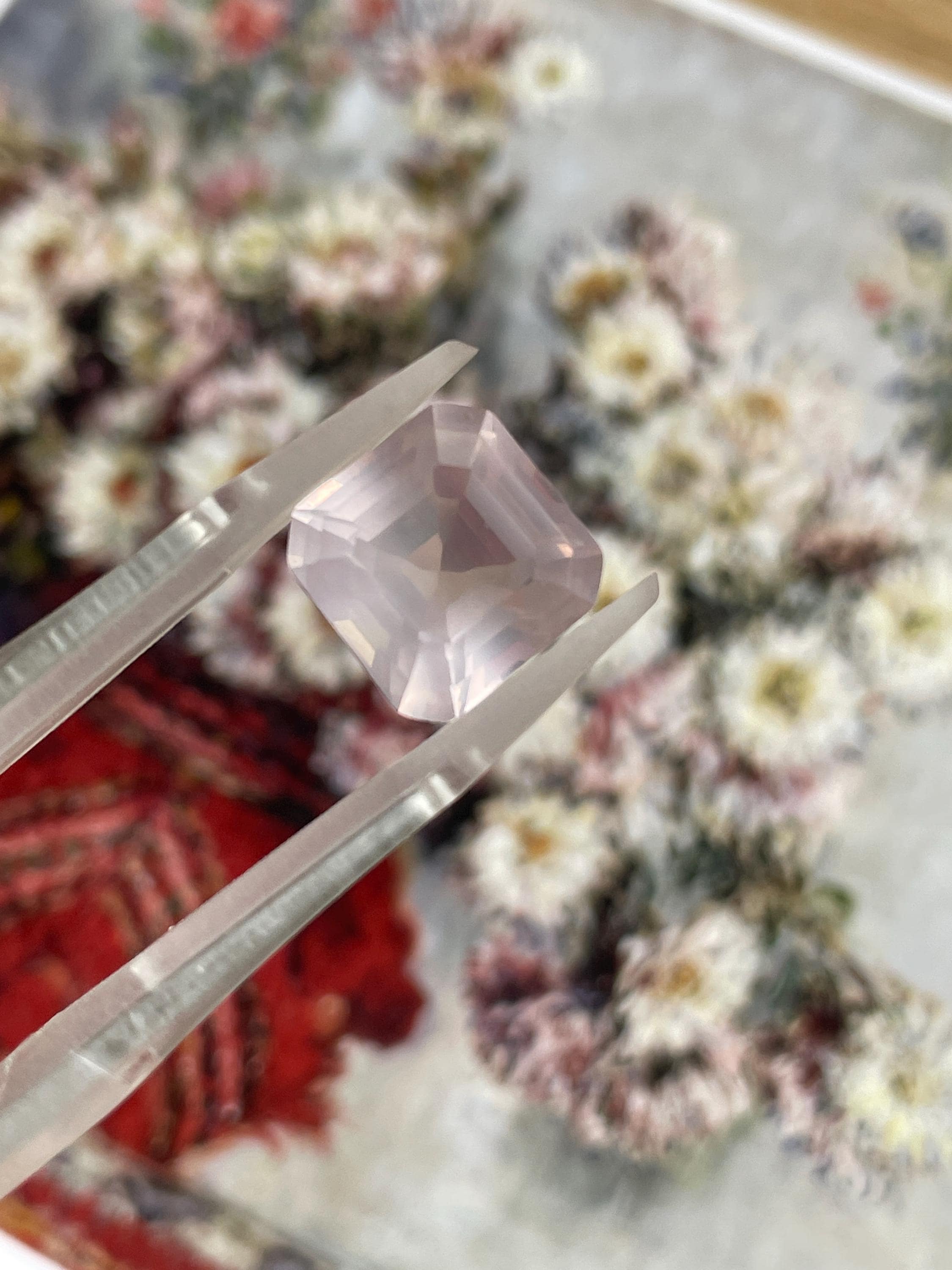 This soft pastel, delicate pink 5.09ct faceted rose quartz features the classic squared octagonal asscher cut that showcases elegance and romance. The milkiness also gives it a dreamy vibe, making it perfect for rings, pendants, or any custom designs.