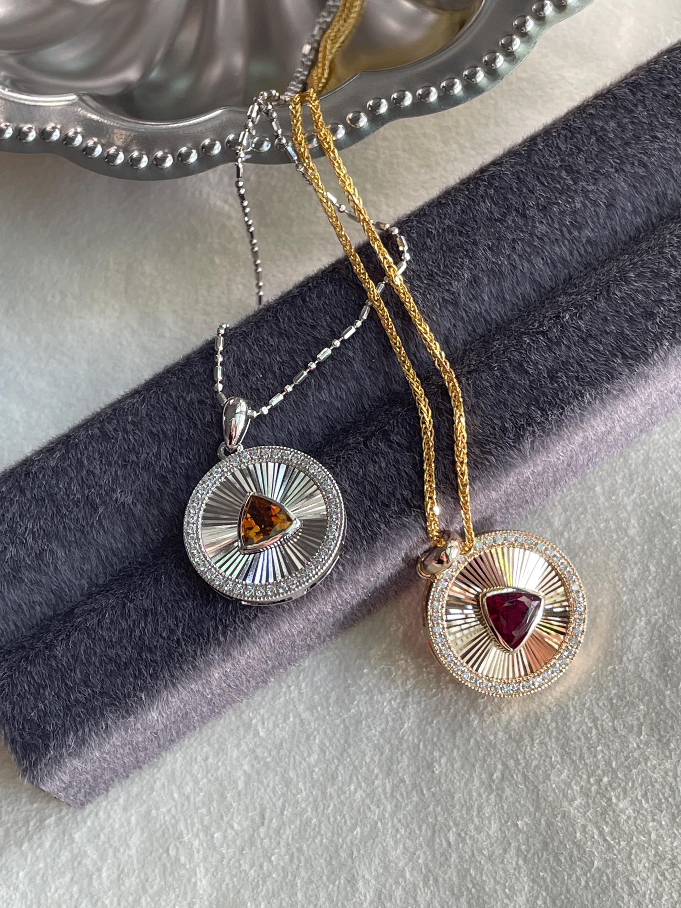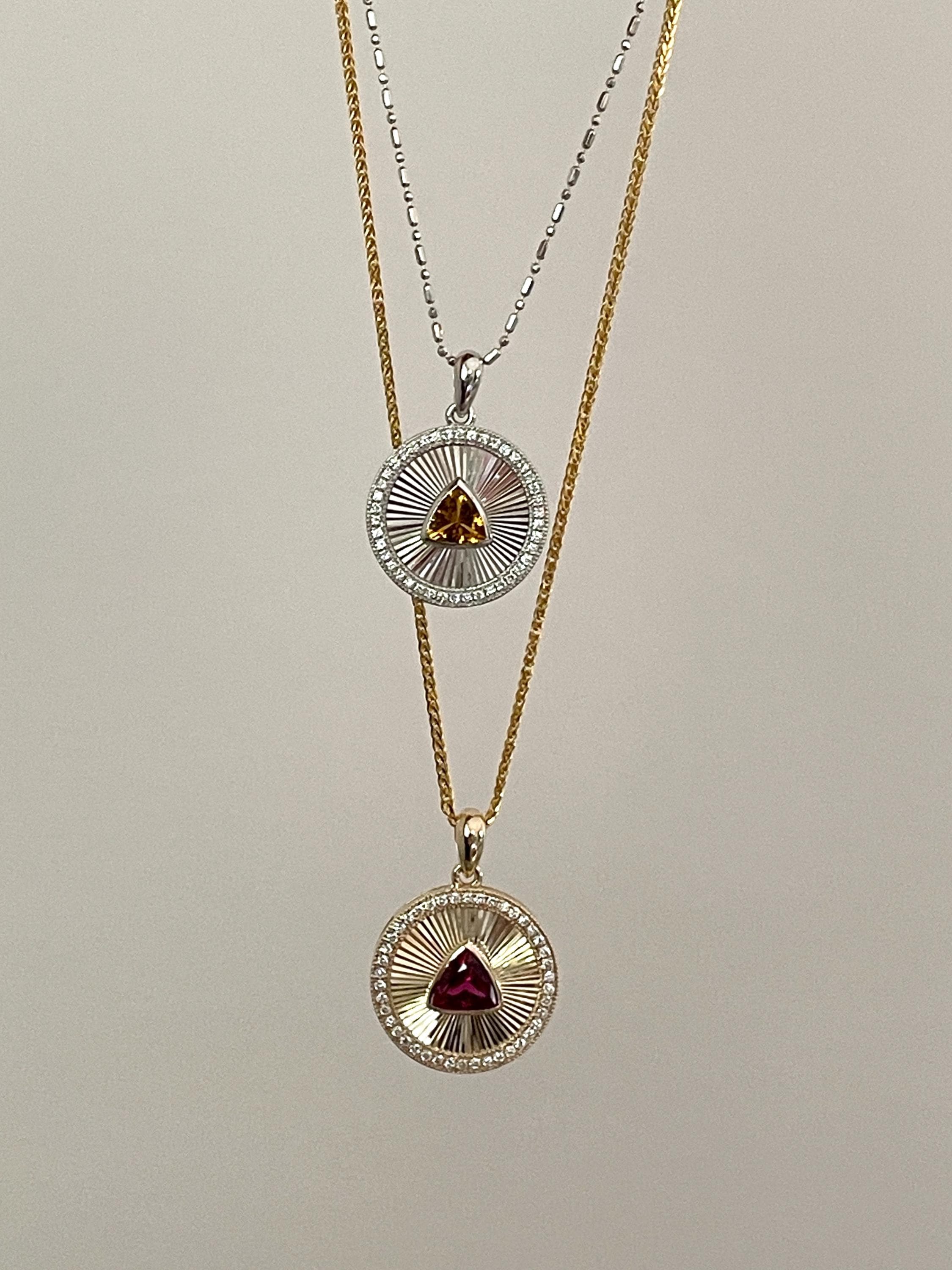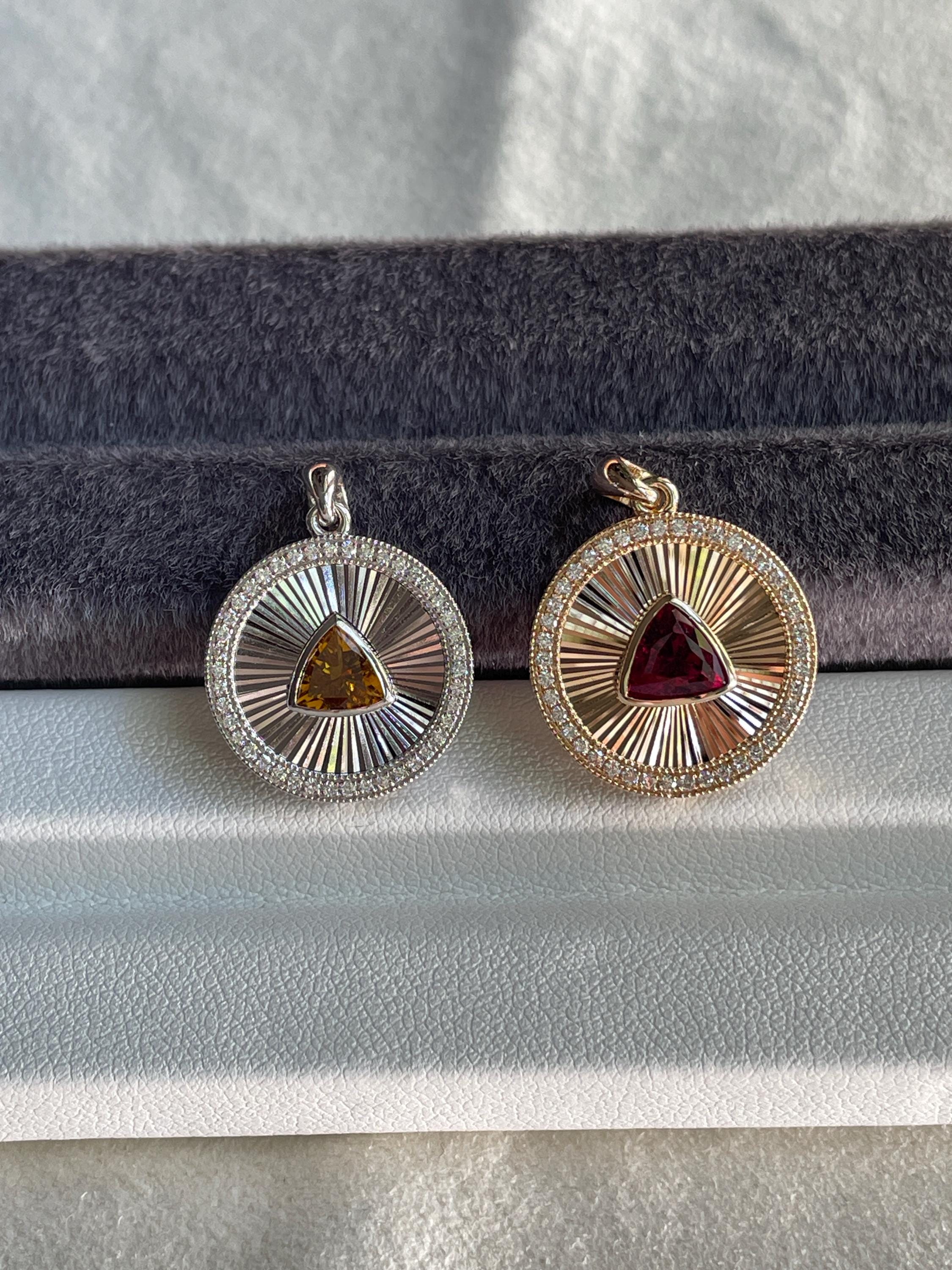 Medallion Pendant, featuring a stunning Rubellite set in luxurious 14k Gold or a vibrant Yellow Tourmaline in 925 Sterling Silver with 18k white gold plated.